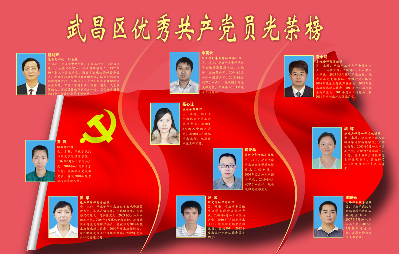 2013年7月,靳剑辉、黄微、郭华、聂心琼、李冀云、鞠登磊、汤云、成曙光、胡婷、雷小明10名同志被评为武昌区“优秀共产党员”